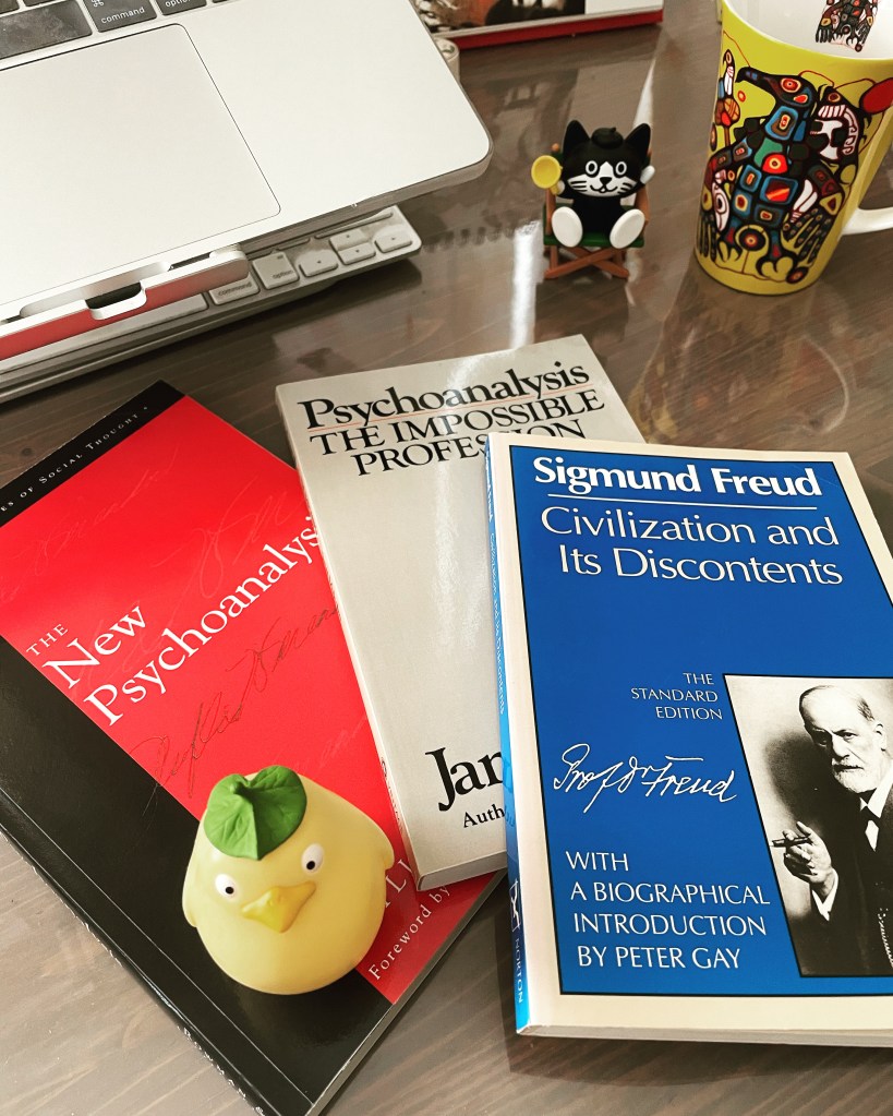 精神分析这条职业道路意味着对人性和人心的无尽好奇、永不间断的自我探索、面对人生真相时的勇气和接纳,以及对爱与慈悲不息的信念和追求,所以它并不会让从业者时时舒适,反而会带来数不清的、常常很艰巨的挑战。2017年春天,为了帮助自己决定是否要成为一个精神分析师,我读了三本书(见左图)。我当时的分析师Dr. K说,弗洛伊德的《文明及其不满》[i]是一本易于理解的书,适合作为入门读物。可惜我身为具有宗教精神的人,感到难以接受老弗爷对宗教的质疑,也就没有读完这本书(——我推荐收集了老弗爷1909年在美国克拉克大学对公众五次演讲的《Five Lectures》作为了解精神分析的入门书;这一系列演讲的总标题是“精神分析的起源与发展”)。当然,他的出发点带有个人的历史印记,有犹太知识分子对犹太教和一神教的批判蕴含在其观点中,但那时的我并没有去思考这些细节。是Phyllis Meadow的《新精神分析》[ii]令我初步了解了精神分析的临床过程和“情感沟通”(emotional communication)的概念,也促使我选择从社工学院毕业后去其创立的学校系统地学习“现代精神分析”(我虽然已经离开这所学校并对其教学方式颇有不满,但Dr. Meadow是我很喜欢的一个精神分析理论家,我所读过的她的书和文章全都充溢着对人性的深刻理解和对病人的巨大悲悯)。我读得最有兴味的一本书,则是美国记者、《纽约客》杂志撰稿人Janet Malcolm的调查纪实作品《精神分析:不可能的职业》[iii]。这本书的内容基本上是关于上世纪七十年代,但读来却不令人觉得十分过时。作者的主要采访对象都来自纽约精神分析学院(NYPI,现称NYPSI),因此除了介绍弗洛伊德思想的发展、精神分析界的理论分歧、对精分疗法的实证研究、来访者的可分析性、移情与终止关系的问题,还涉及了NYPI的秘闻和八卦。读到该书所描写的分析师面临的挑战和职业性的伤害,反而愈加激发了我想要接受精神分析训练的动力:把不可能变成可能,或者至少永不言弃地接近那个真实表达、真实沟通且心灵自由的可能性,会是多美妙的一件事!