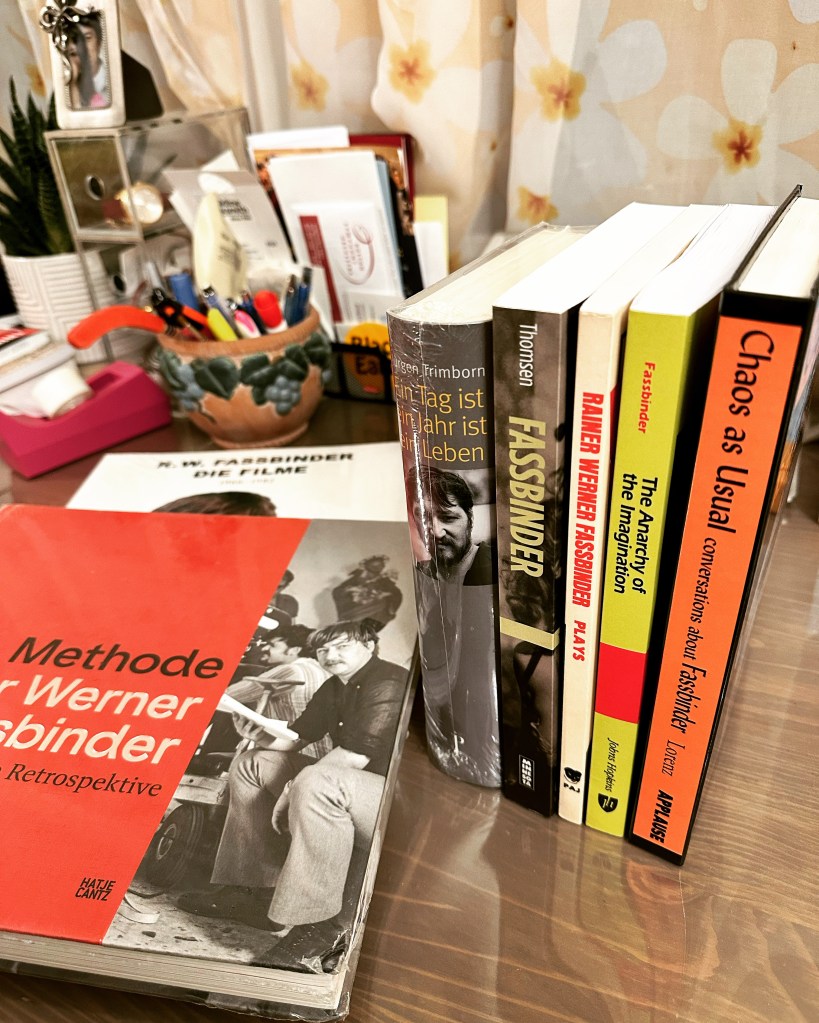 2023年8月,我又一次从德国旅行归来。那一趟的旅途中,我在法兰克福的德国电影博物馆书店内久久盘桓,最终冒着行李超重的风险咬牙购买了一本图文并茂的法斯宾德电影年谱。回家后,我又从北美和德国的亚马逊网站上邮购了几本有关法胖的书籍。其中一部传记的题目叫作《一天是一年是一生》,这句话精确地概括了法斯宾德短暂而天才耀目的一生。我至今没有足够的德语水平去阅读这本书,但每当我的目光从书架上扫过这本硬皮书的书脊,心里都会涌上难以言传的怅惘、悲哀、激动和感慨。我绝不会希望自己或身边任何一个人活成法斯宾德的样子,但我羡慕他的才华,也尊重他的离经叛道。他来过我们这个“爱比死更冷”的人世间,并且留下了41部高质量的作品,他的电影在今天依然启迪着全世界的艺术电影迷。对我本人来说,更重要的是,法斯宾德活成了我(或许还有阅读这篇影评的你们)在精神世界中,无法示人的那部分样貌。我们早已选择了在道貌岸然的社会环境里做一个“正常人”,但幸好法斯宾德来过我们的世界,幸好,他以极高的艺术水准表达了人性中经常被压抑的那些内容。